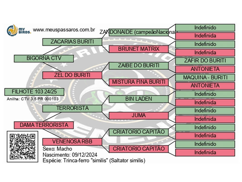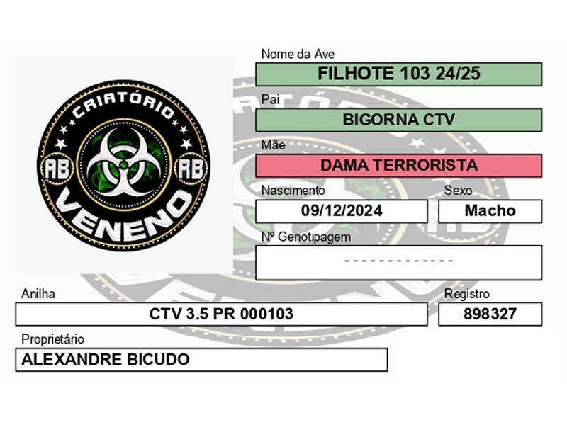 Comentários: FILHO DO BIGORNA AVE MUITO SÉRIA UM FENÔMENO EM RODAS, MEGA VELOCISTA COM ESTILO MARAVILHOSO EM UMA DAS MATRIZES DE MAIS TOP DO CRIATÓRIO, LEVANDO RESULTADO DIRETO E SANGUE DO CAMPEÃO NACIONAL ZANDONAIDE DO VELOCISTA MÁQUINA E TAMBÉM DO CRUEL, ALÉM DO BINLADEM E VENENOSA RBB. FILHOTE JÁ ESTÁ DEMONSTRANDO MUITA QUALIDADE.