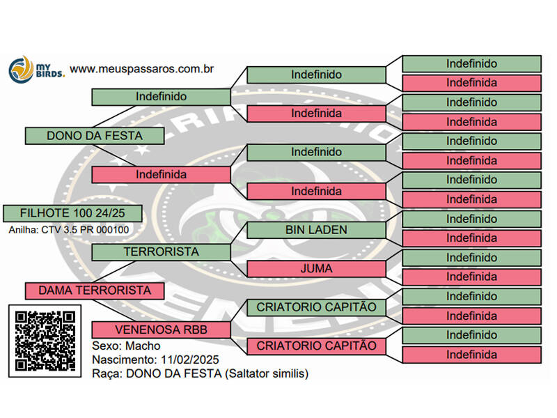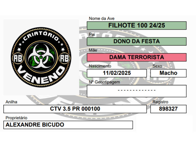 Comentários: FILHO DO FENÔMENO DONO DA FESTA AVE COM MÉDIA DE 239 CANTOS EM 40 PARTICIPAÇÕES ONDE OBTEVE MAIS DE 90% DE VITÓRIAS, PASSADO NA MÃE DO SPKE CAMPEÃO REGIONAL NO PARANÁ, LEVANDO SANGUE DE BINLADEM E CAPITÃO VENENO, UMA CRUZA MUITO PLANEJADA!
